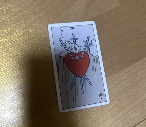소드 3번 카드를 자세히 살펴보면, 카드 배경에는 먹구름과 비가 내리는 장면이 그려져 있습니다. 그리고 중앙에는 하트 모양에 세 개의 검이 꽂혀 있는 모습이 보이는데요.