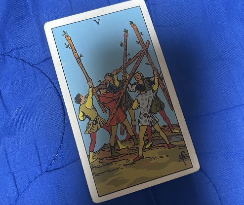 - 지팡이 5개: 서로 부딪히는 모습은 열정, 에너지, 경쟁심, 도전 정신을 의미