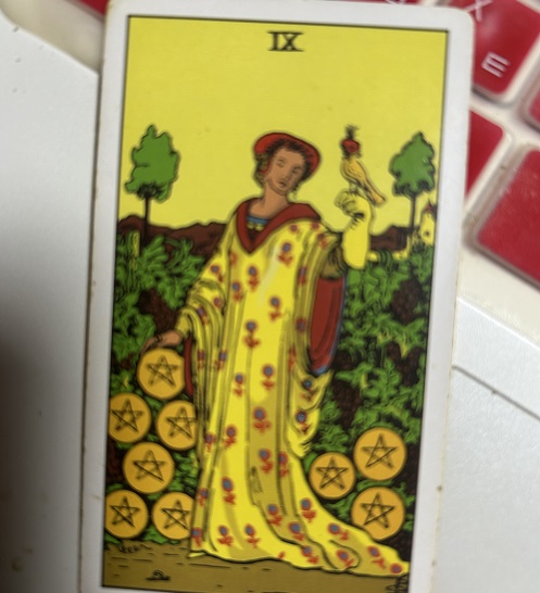 카드 속에서 한 여성을 보게 되면 풍요로운 정원에서 홀로 서 있으며, 평온한 표정과 더불어 매우 안정적으로 보입니다. 이는 독립적인 삶과 자기 완성을 상징합니다. 잘 가꾸어진 포도나무와 펜타클은 물질적 풍요와 노력의 결실을 의미합니다. 매는 절제된 욕망과 통제된 감정을 상징해, 충동보다는 이성적인 판단으로 안정된 삶을 유지하고 있음을 보여줍니다. 단정한 옷차림은 품위와 자존감을 나타내며, 내면과 외면의 균형이 잘 잡힌 상태를 뜻합니다. 전체적으로 나인 오브 펜타클은 혼자서도 충분히 만족스러운 삶을 살아갈 수 있는 성숙한 단계를 상징하는 카드입니다.